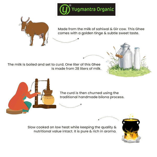 - ✔ MADE FROM CURD AND NOT CREAM:- Our Ghee 100% Pure & Natural - Prepared by Traditional Bilona Method Churned from Curd made completely with hands In this process, cow’s milk is obtained naturally from the Sahiwal cows. Then the milk is boiled and cooled and a spoonful of curd is added to it and kept overnight Golden & Testy Desi Ghee